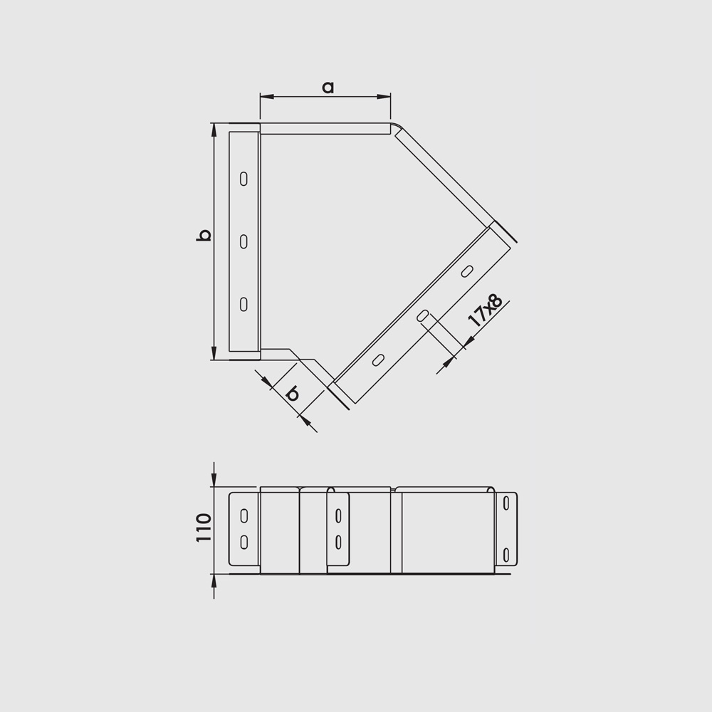 Krivina 45° za nosače kablova visine 110 mm. Koristi se kod formiranja krivina koje su pod uglom od 45°.