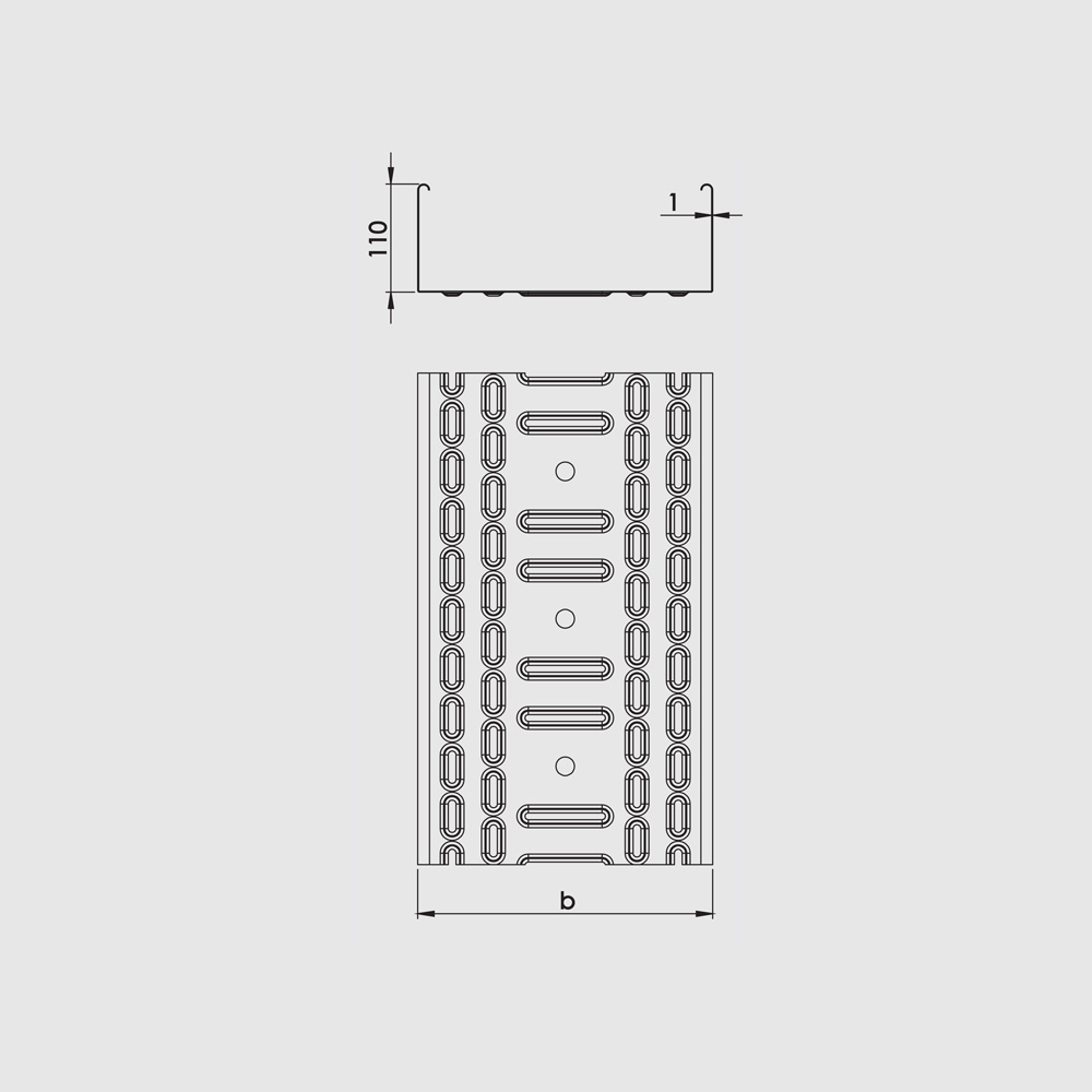 SNK regal sa bočne visine 110 mm. Zahvaljujući podnim upuštenim perforacijama omogućuje se brzo i lako spajanje regala sa konzolom u veličinama od 50 do 600mm. Bočne perforacije 8 x 32 mm omogućuju neophodnu ventilaciju. Podna perforacija prečnika 11 mm, omogućuje direktno vezivanje regala pomoću navojne šipke. Nosač kablova isporučuje se u dužinama 2000mm, 3000mm i 6000mm. Nosač kablova isporučuje se sa svim relevantnim pričvrsnim sistemima.