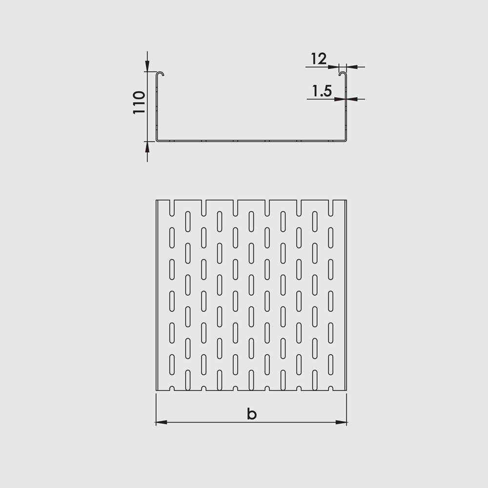 VNK regal sa bočne visine 110 mm. Zahvaljujući podnim perforacijama omogućuje se brzo i lako spajanje regala sa konzolom u veličinama od 50 do 600mm. Bočne perforacije 8 x 32 mm omogućuju neophodnu ventilaciju. Nosač kablova isporučuje se u dužinama 2000mm, 3000mm i 6000mm. Nosač kablova isporučuje se sa svim relevantnim pričvrsnim sistemima.