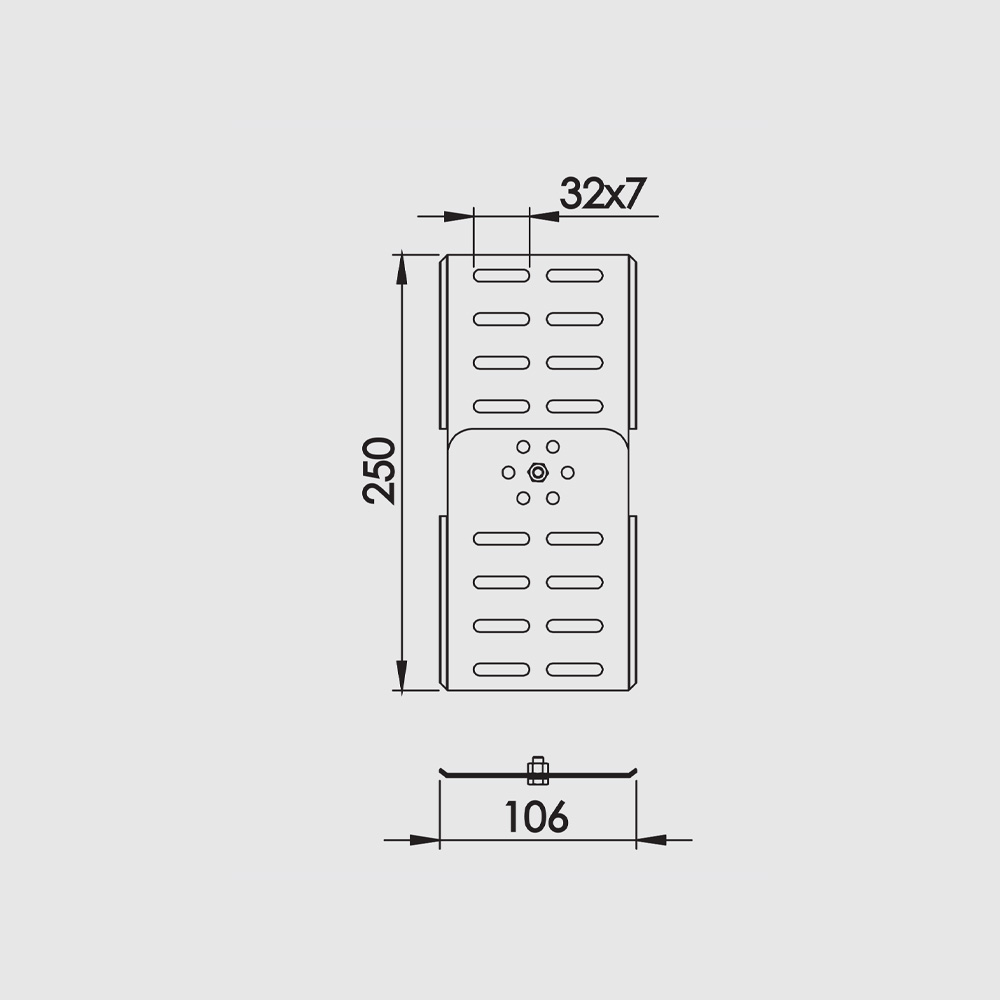Zglobna spojnica za nosače kablova visine 110 mm. Koristi se kod premošćivanja visinskih razlika za određene tipove regala.