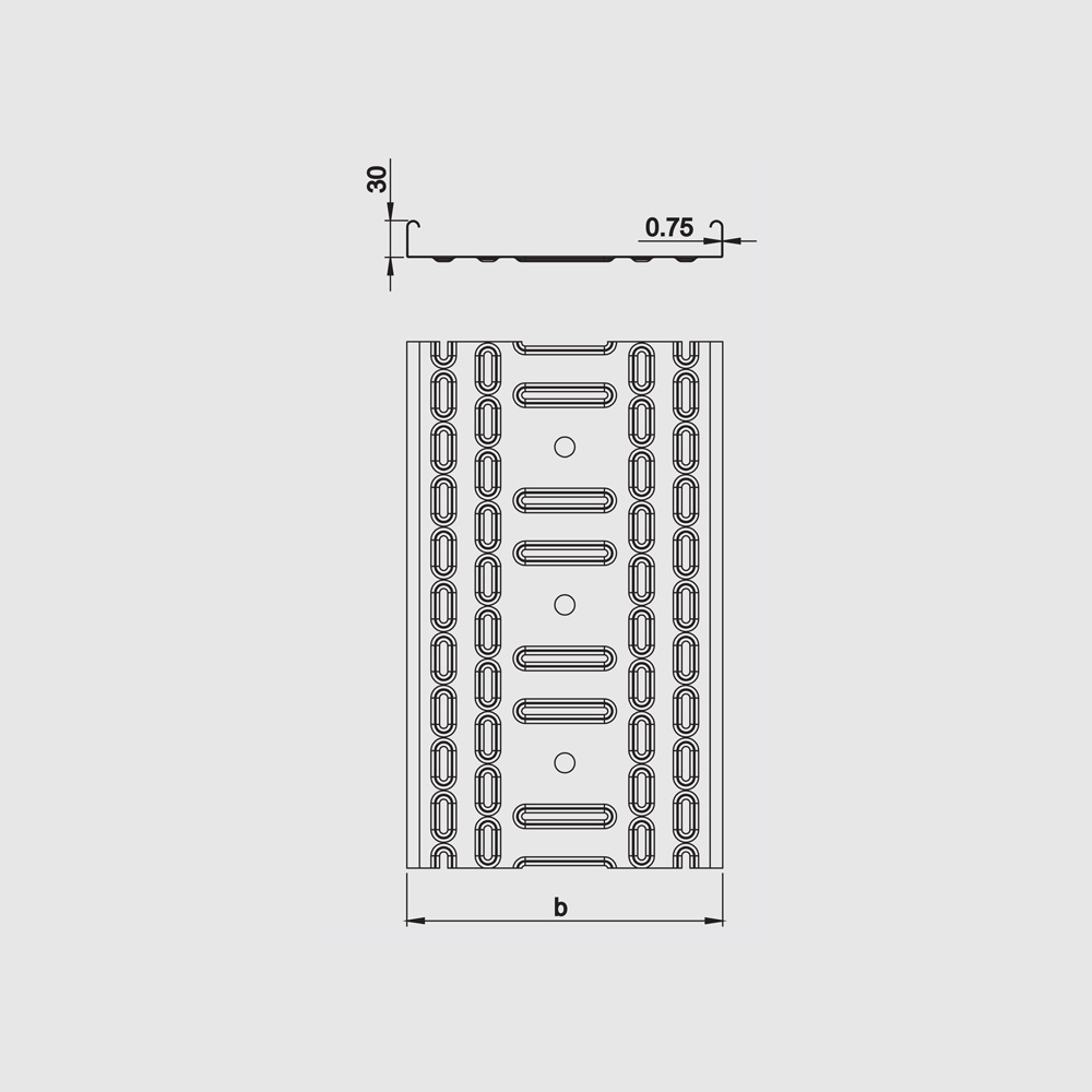 PNK regal sa “master click” sistemom, bočne visine 30 mm. Nosač kablova na sebi sadrži integrisanu click spojnicu koja obezbeđuje izjednačavanje potencijala celom dužinom bez dodatnih elemenata. Zahvaljujući podnim upuštenim perforacijama omogućuje se brzo i lako spajanje regala sa konzolom u veličinama od 50 do 600mm. Bočne perforacije 7 x 24 mm omogućuju neophodnu ventilaciju. Podna perforacija prečnika 11 mm, omogućuje direktno vezivanje regala pomoću navojne šipke. Nosač kablova isporučuje se u dužinama 2000mm i 3000mm i 6000mm. Click sistem spajanja regala koji su razvili PEKOM inženjeri razvoja, isporučuje se kao integrisani deo regala bez dodatnih elemenata (žabica od opružnog lima, vijaka i matica).